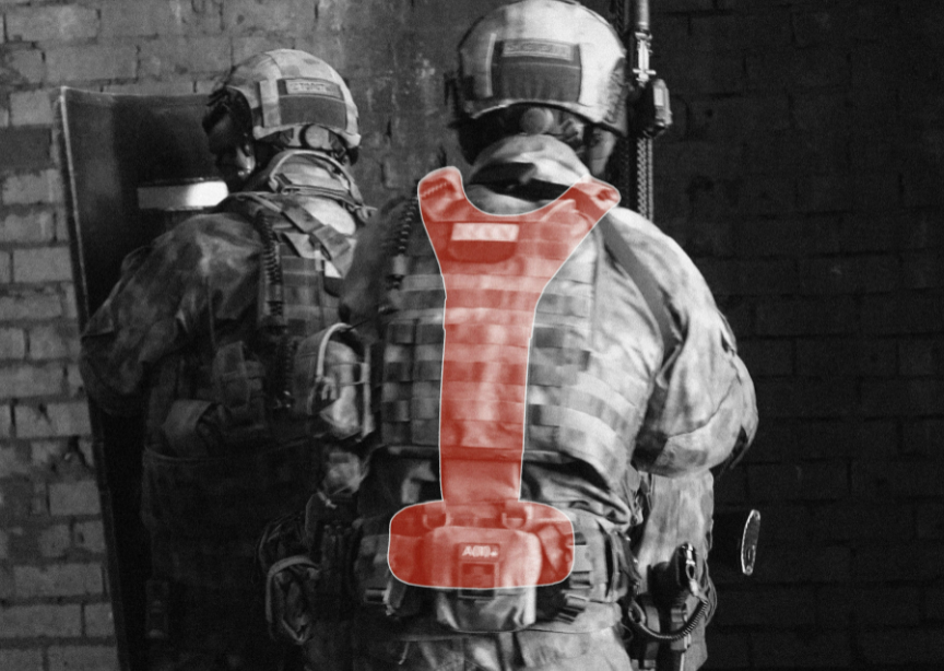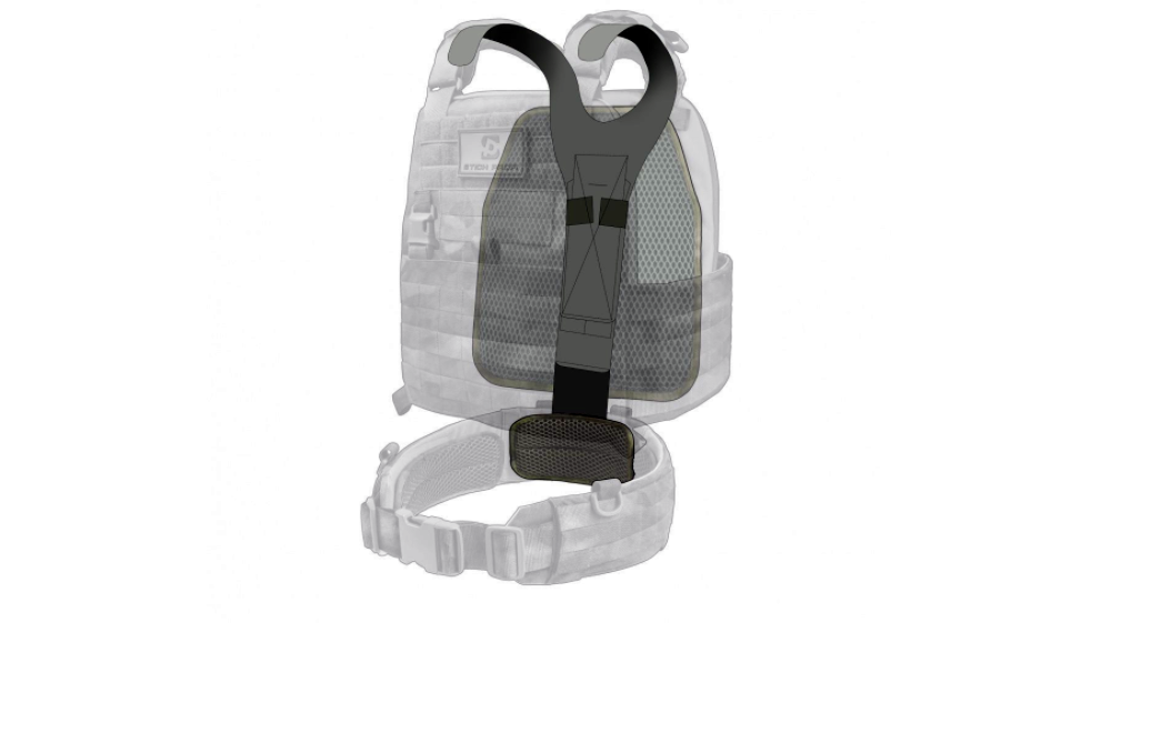- Система переноса нагрузки расположена вдоль позвоночника, что исключает вероятность повреждения и возможность зацепиться системой за оружие, ветки или оборудование.