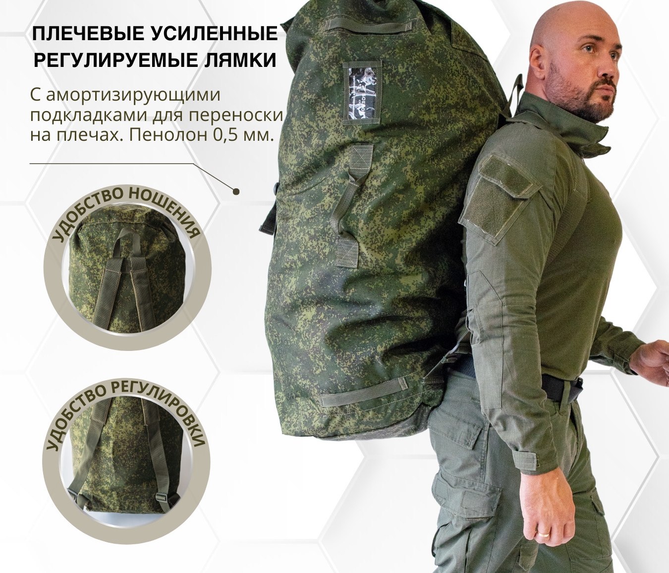 Конструкция: Плечевые усиленные регулируемые лямки с амортизирующими подкладками для переноски на плечах,