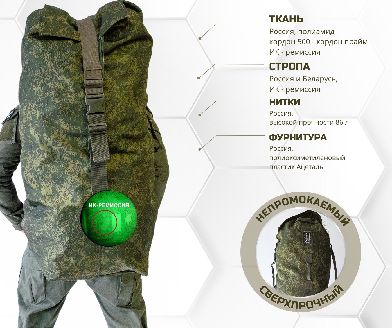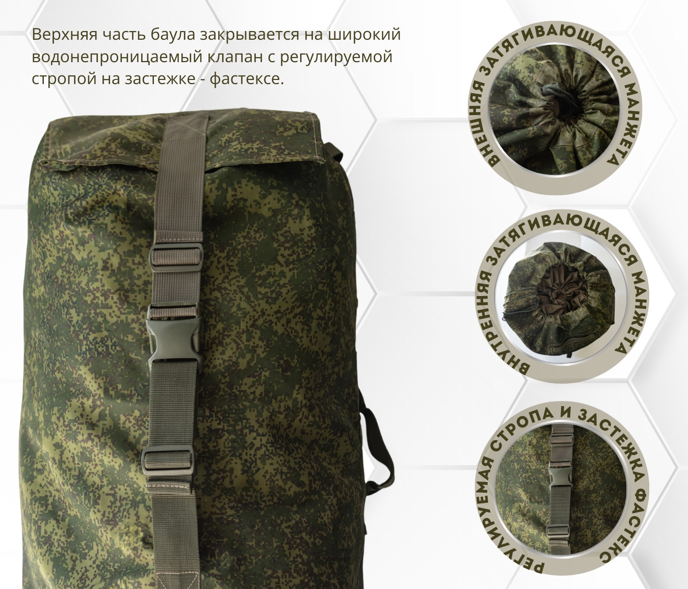 Также верхняя часть армейского вещмешка закрывается на широкий водонепроницаемый клапан с регулируемой стропой на застежке - фастексе.