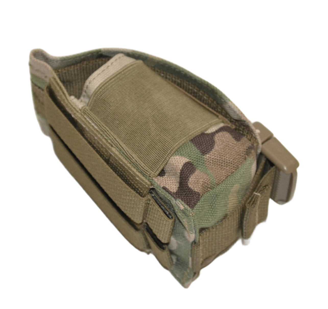 Данный подсумок можно прикрепить при помощи системы MOLLE на тактический разгрузочный пояс, вместе с подсумками под магазины АК и аптечкой.