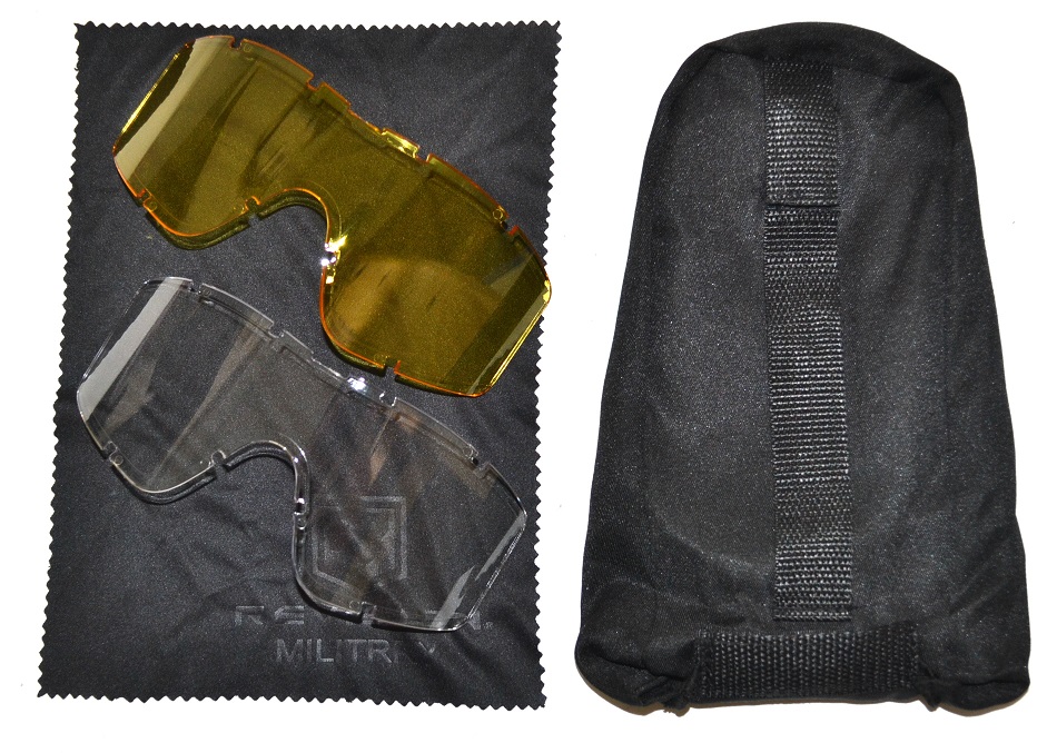 В комплекте плотный футляр, 3 (три) дополнительные сменные линзы, ремешок-резинка для очков, ремешок с креплением (ВЕЛКРО), мягкий чехол для очков, мягкий чехол для линз, микрофибровая салфетка.
