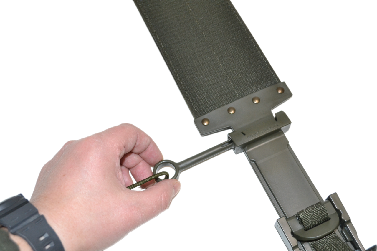 Система переноса нагрузки расположена вдоль позвоночника, что исключает вероятность повреждения и возможность зацепиться системой за оружие, ветки или оборудование.