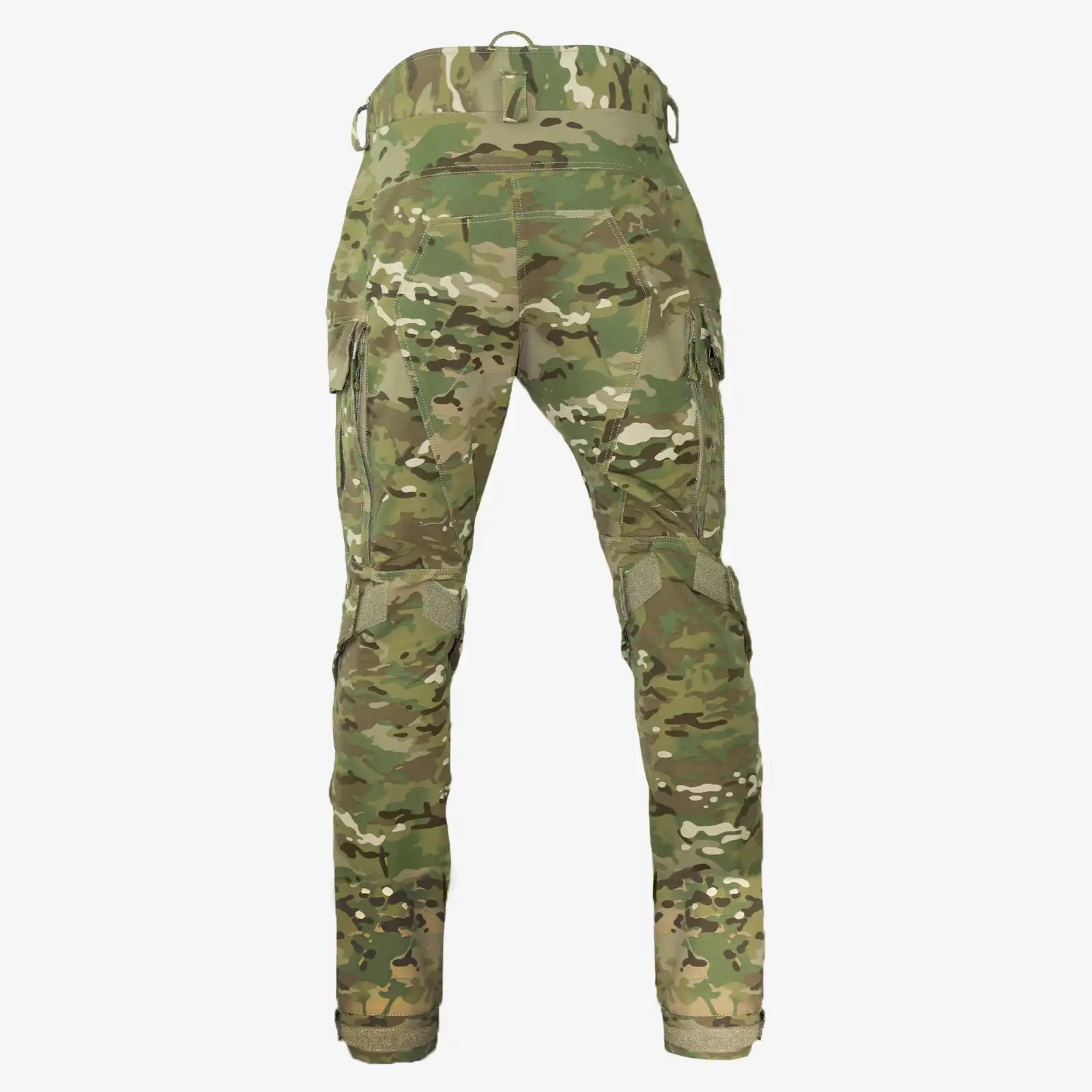 На передних половинках брюк расположены удобные подкройные карманы с лёгким и быстрым доступом в них. На боковом шве на уровне бедра расположены накладные карманы увеличенного объёма. Карманы утягиваются при помощи эластичного жгута и фиксатора, а также закрываются при помощи клапана и застёжки на две пуговицы и прорезные петли. Застёжка супатная. На боковом шве на уровни голени расположены накладные карманы небольшого объема с клапаном и застёжкой велкро. На задних половинках брюк расположены прорезные карманы с клапанами и супатной застёжкой на две пуговицы на тесьме и прорезные петли. Низ брюк имеет утяжку с шнуром в кулисе.